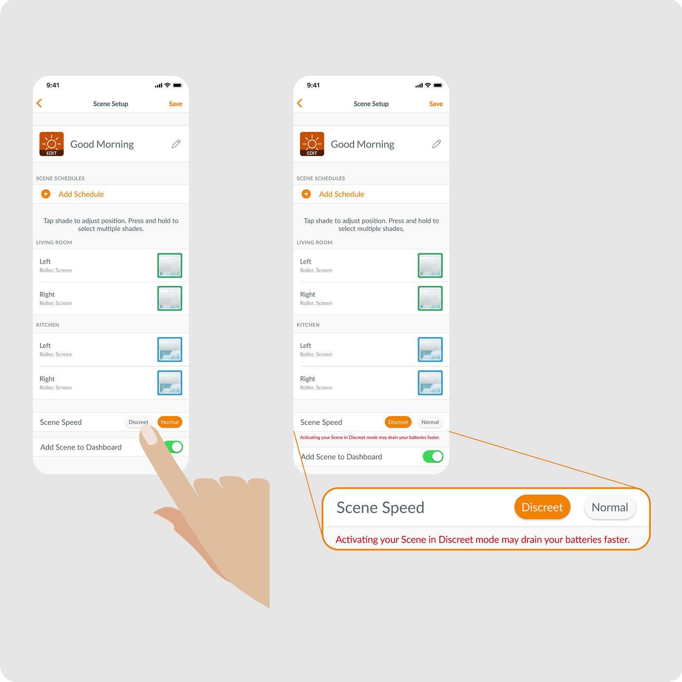 To activate Discreet Mode, go to the Scene Settings page in the app and select “Discreet” for the Scene speed.