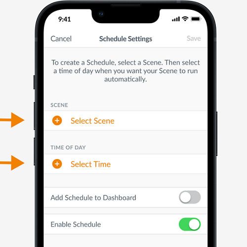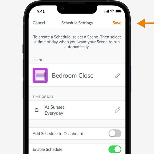 2. Select the Scene you want to schedule, then choose the time and days you want your shades to move. Tap “Done” after each step.